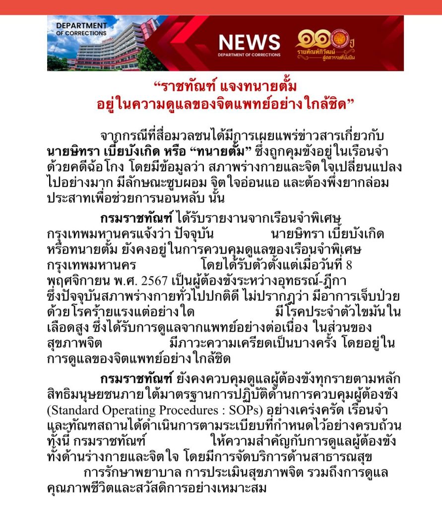 กรมราชทัณฑ์ ได้รับรายงานจากเรือนจำพิเศษกรุงเทพมหานครแจ้งว่า ปัจจุบัน นายษิทรา เบี้ยบังเกิด หรือทนายตั้ม ยังคงอยู่ในการควบคุมดูแลของเรือนจำพิเศษกรุงเทพมหานคร โดยได้รับตัวตั้งแต่เมื่อวันที่ 8 พฤศจิกายน พ.ศ. 2567 เป็นผู้ต้องขังระหว่างอุทธรณ์-ฎีกา ซึ่งปัจจุบันสภาพร่างกายทั่วไปปกติดี ไม่ปรากฎว่า มีอาการเจ็บป่วยด้วยโรคร้ายแรงแต่อย่างใด มีโรคประจำตัวไขมันในเลือดสูง ซึ่งได้รับการดูแลจากแพทย์อย่างต่อเนื่อง ในส่วนของสุขภาพจิต มีภาวะความเครียดเป็นบางครั้ง โดยอยู่ในการดูแลของจิตแพทย์อย่างใกล้ชิด
