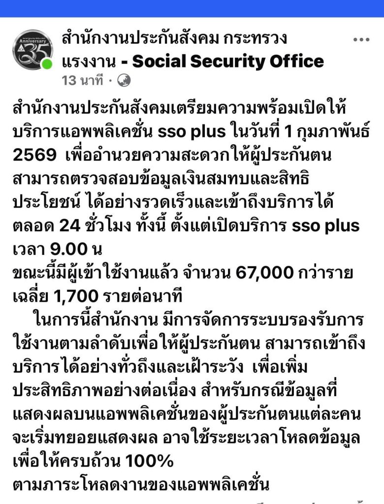 เมื่อวันที่ 1 ก.พ. ผู้สื่อข่าวรายงานว่า สำนักงานประกันสังคมได้เตรียมความพร้อมเปิดให้บริการแอพพลิเคชั่น sso plus โดยระบุว่า ในวันที่ 1 กุมภาพันธ์ 2569 เพื่ออำนวยความสะดวกให้ผู้ประกันตนสามารถตรวจสอบข้อมูลเงินสมทบและสิทธิประโยชน์ ได้อย่างรวดเร็วและเข้าถึงบริการได้ตลอด 24 ชั่วโมง ทั้งนี้ ตั้งแต่เปิดบริการ sso plus เวลา 9.00 น. ขณะนี้มีผู้เข้าใช้งานแล้ว จำนวน 67,000 กว่าราย เฉลี่ย 1,700 รายต่อนาที