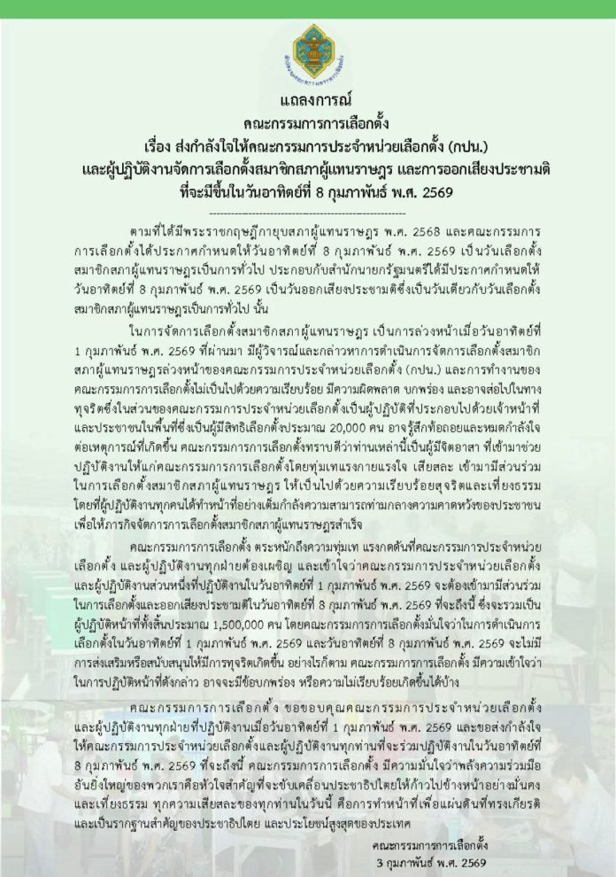 วันที่ 3 ก.พ.69 คณะกรรมการการเลือกตั้ง ออกแถลงการณ์เรื่อง ส่งกำลังใจให้คณะกรรมการประจำหน่วยเลือกตั้ง (กปน.) และผู้ปฏิบัติงานจัดการเลือกตั้งสมาชิกสภาผู้แทนราษฎร และการออกเสียงประชามติ ที่จะมีขึ้นในวันอาทิตย์ที่ 8 กุมภาพันธ์ พ.ศ. 2569 ระบุ