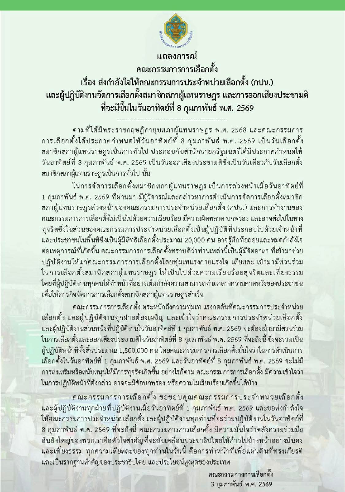 คณะกรรมการการเลือกตั้ง ขอขอบคุณคณะกรรมการประจำหน่วยเลือกตั้ง และผู้ปฏิบัติงานทุกฝ่ายที่ปฏิบัติงานเมื่อวันอาทิตย์ที่ 1 กุมภาพันธ์ พ.ศ. 2569 และขอส่งกำลังใจ ให้คณะกรรมการประจำหน่วยเลือกตั้งและผู้ปฏิบัติงานทุกท่านที่จะร่วมปฏิบัติงานในวันอาทิตย์ที่ 8 กุมภาพันธ์ พ.ศ. 2569 ที่จะถึงนี้ คณะกรรมการการเลือกตั้ง มีความมั่นใจว่าพลังความร่วมมืออันยิ่งใหญ่ของพวกเราคือหัวใจสำคัญที่จะขับเคลื่อนประชาธิปไตยให้ก้าวไปข้างหน้าอย่างมั่นคงและเที่ยงธรรม ทุกความเสียสละของทุกท่านในวันนี้ คือการทำหน้าที่เพื่อแผ่นดินที่ทรงเกียรติและเป็นรากฐานสำคัญของประชาธิปไตยและประโยชน์สูงสุดของประเทศ