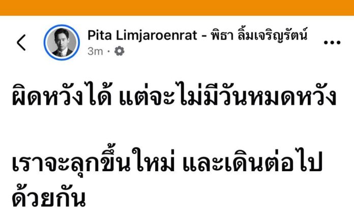 ทั้งนี้ การโพสต์ของนายพิธาถูกมองว่าเป็นการสื่อสารเพื่อย้ำจุดยืนทางการเมือง และปลุกขวัญกำลังใจผู้ที่ยังคงเชื่อมั่นในแนวทางการเปลี่ยนแปลง พร้อมยืนยันว่าจะเดินหน้าทำงานทางการเมืองต่อไปอย่างไม่ย่อท้อ