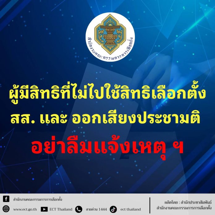 วันที่ 9 ก.พ.2569 ที่สำนักงานคณะกรรมการการเลือกตั้ง เตือนผู้มีสิทธิที่ไม่ไปใช้สิทธิเลือกตั้ง สส. และออกเสียงประชามติ เมื่อวานนี้ อย่าลืมแจ้งเหตุไม่ไปใช้สิทธิ สามารถแจ้งเหตุที่ไม่อาจไปใช้สิทธิ ระหว่างวันที่ 9 – 15 กุมภาพันธ์ 2569 ในกรณีไม่ได้ไปใช้สิทธิเลือกตั้ง สส. สามารถแจ้งผ่านช่องทางอิเล็กทรอนิกส์ผ่าน เว็บไซต์สำนักงาน กกต. www.ect.go.th หรือเว็บไซต์กรมการปกครอง https://boraservices.bora.dopa.go.th/election/abscausess/ หรือ แอปพลิเคชัน “ทางรัฐ” หรือแอปพลิเคชัน Smart Vote หรือพิมพ์คำว่าแจ้งเหตุการเลือกตั้ง สส. หรือยื่นด้วยตนเองต่อนายทะเบียนอำเภอ / นายทะเบียนท้องถิ่น ส่งทางไปรษณีย์ลงทะเบียน ทำเป็นหนังสือมอบหมายให้บุคคลอื่นไปยื่นแทน