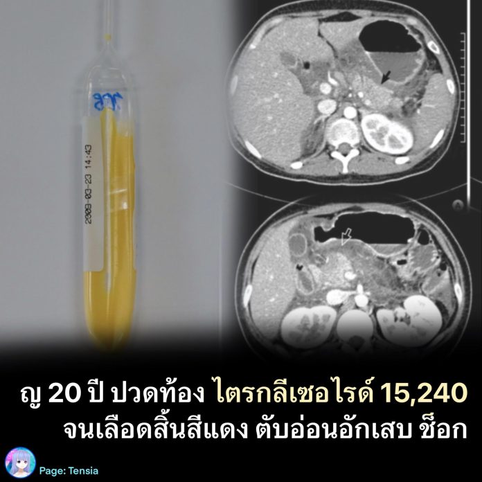 หญิง 20 ปี ปวดท้อง อาเจียน เจาะเลือดเจอไตรกลีเซอไรด์ 15,240, เลือดเป็นกรดรุนแรง และตับอ่อนกำลังอักเสบระดับหายนะ