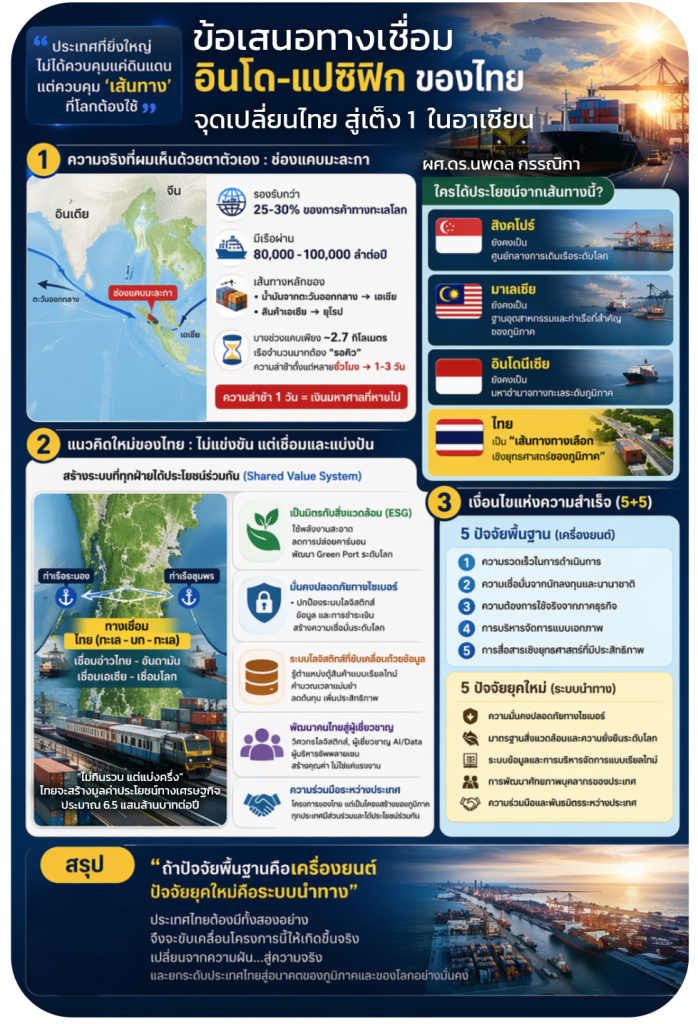 ประเทศไทย…ยังไม่ได้ใช้ศักยภาพของตนเองอย่างเต็มที่ และในจุดนั้นเอง ผมเริ่มตั้งคำถามกับตัวเองอีกครั้งว่า “ถ้าโลกต้องพึ่งเส้นทางเดียวขนาดนี้…แล้วถ้าวันหนึ่งเส้นทางนี้สะดุดขึ้นมา…จะเกิดอะไรขึ้น” คำถามนั้น…คือจุดเริ่มต้นของคำตอบที่ผมกำลังจะเล่าต่อไปครับ จากความฝันเรื่องคลองไทย…สู่ “ทางเลือกของโลก” ที่ทุกประเทศได้ประโยชน์ร่วมกัน ผมมีข้อเสนอครับ….แนวคิดใหม่ของไทย “ไม่ใช่แข่ง…แต่เชื่อมและแบ่งปัน” ในอดีต เรามักคิดว่า ถ้าไทยสร้างทางเลือกใหม่ แปลว่าเราจะ “แย่ง” บทบาทจากประเทศอื่น แต่จากประสบการณ์ที่ผมได้เรียนรู้ในเวทีนานาชาติ แนวคิดยุทธศาสตร์สมัยใหม่ ไม่ใช่ “ผู้ชนะมีคนเดียว” แต่คือ “สร้างระบบที่ทุกฝ่ายได้ประโยชน์ร่วมกัน (Shared Value System)” โมเดลใหม่ ไทยเป็น “ส่วนเสริม” ไม่ใช่ “มาแทนที่” ผมขอเสนอ “ทางเชื่อม อินโด-แปซิฟิก ของไทย” ในมุมใหม่ว่า: สิงคโปร์ ยังคงเป็นศูนย์กลางการเดินเรือระดับโลก, มาเลเซีย ยังคงเป็นฐานอุตสาหกรรมและท่าเรือที่สำคัญของภูมิภาค, อินโดนีเซีย ยังคงเป็นมหาอำนาจทางทะเลระดับภูมิภาค และประเทศไทย เป็น “เส้นทางทางเลือกเชิงยุทธศาสตร์ของภูมิภาค” เมื่อไทย “ไม่กินรวบ แต่แบ่งครึ่ง” ไทยจะสร้างมูลค่าประโยชน์ทางเศรษฐกิจประมาณ 6.5 แสนล้านบาทต่อปี นี่ไม่ใช่การแย่ง แต่คือการ “เพิ่มความยืดหยุ่นความสมดุลทางเศรษฐกิจให้ทั้งระบบในอาเซียน”
