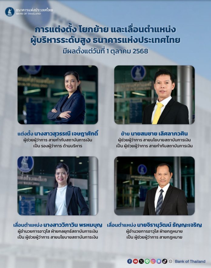 บอร์ดธปท.มีมติแต่งตั้ง โยกย้าย และเลื่อนตำแหน่งผู้บริหารระดับสูง โดยให้มีผลตั้งแต่วันที่ 1 ตุลาคม 2568