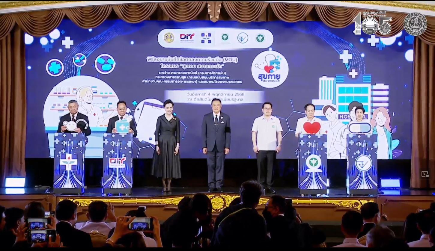 เมื่อเวลา 14.00 น. วันที่ 4 พ.ย. ที่ตึกสันติไมตรี (หลังนอก) ทำเนียบรัฐบาล นายอนุทิน ชาญวีรกูล นายกรัฐมนตรีและรมว.มหาดไทย เป็นประธานพิธีลงนามบันทึกข้อตกลงความร่วมมือ (Memorandum of Understanding : MOU) โครงการ “สุขกาย สบายกระเป๋า” โดยมีนางศุภจี สุธรรมพันธุ์ รมว.พาณิชย์ นายพัฒนา พร้อมพัฒน์ รมว.สาธารณสุข สมาคมโรงพยาบาลเอกชน ตัวแทนร้านขายยา และหน่วยงานเกี่ยวข้องเข้าร่วมงานด้วย