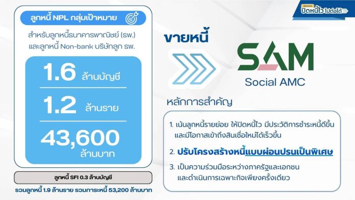 ทั้งนี้หากลูกหนี้สามารถชำระปิดจบได้ (มูลค่าหนี้เฉลี่ยต่ำกว่า 30,000 บาท) บัญชีจะเปลี่ยนเป็นรหัส 11 (ลูกหนี้ปกติ) ทันที หากผ่อนชำระ บัญชีจะเปลี่ยนเป็นรหัส 16 และจะกลับไปรหัส 11 เมื่อผ่อนหมด ซึ่งจะทำให้พวกเขากลับเข้าสู่ระบบสินเชื่อเพื่อประกอบอาชีพได้โครงการนี้จะใช้กับ NPLs ที่ กำหนดวันตัดยอด ณ วันที่ 30 กันยายน 2568 และ SAM จะเริ่มเป็นเจ้าของสินทรัพย์จริงในวันที่ 1 มกราคม 2569