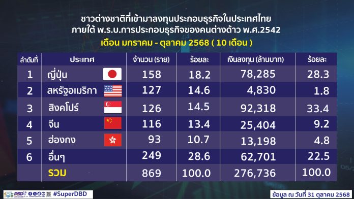 นายพูนพงษ์ นัยนาภากรณ์ อธิบดีกรมพัฒนาธุรกิจการค้า ในฐานะเลขานุการคณะกรรมการการประกอบธุรกิจของคนต่างด้าว เปิดเผยว่า ช่วง 10 เดือนที่ผ่านมา (มกราคม – ตุลาคม) มีการอนุญาตให้คนต่างชาติเข้ามาลงทุนประกอบธุรกิจในประเทศไทย ภายใต้พระราชบัญญัติการประกอบธุรกิจของคนต่างด้าว พ.ศ. 2542 จำนวน 869 รายเพิ่มขึ้น 83 ราย หรือ 11%หากเทียบกับช่วงเดียวกันของปีก่อน