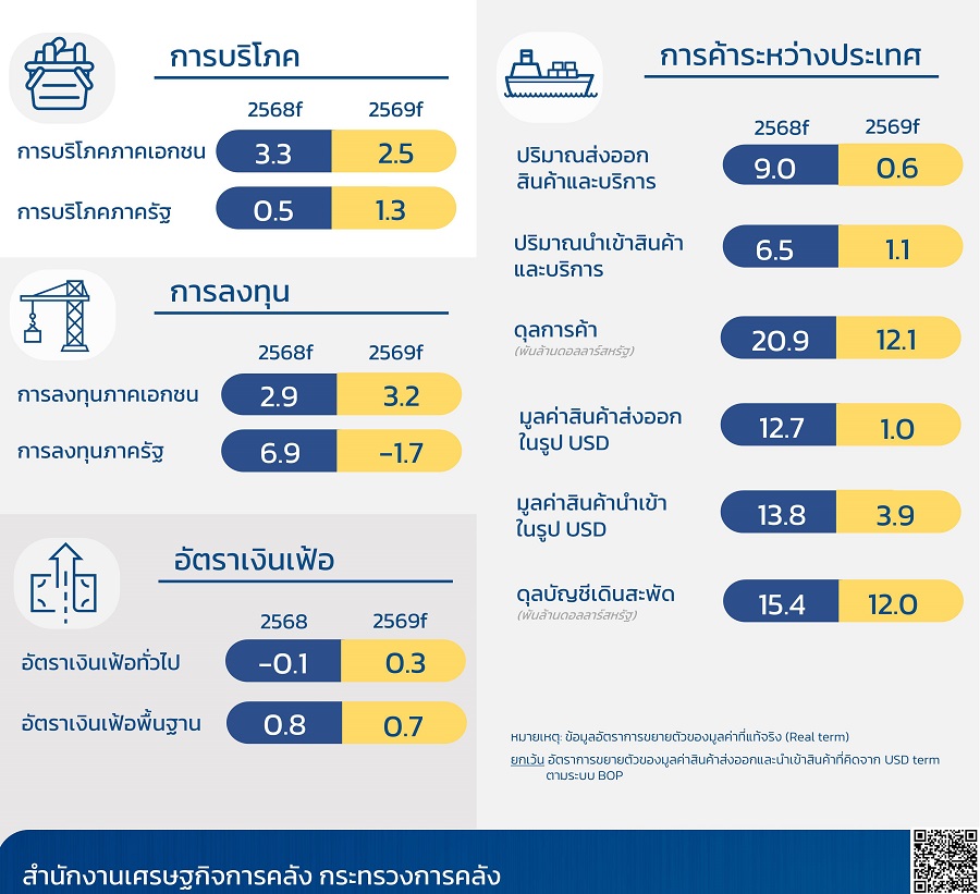 ด้านเศรษฐกิจไทยปี 2569 กระทรวงการคลังคาดว่าเศรษฐกิจไทยจะขยายตัวที่ร้อยละ 2.0 ต่อปี (ช่วงคาดการณ์ที่ร้อยละ 1.5 ถึง 2.5) แม้ภาคการส่งออกจะมีทิศทางชะลอความร้อนแรงลงจากปีก่อนหน้า แต่ยังคงสามารถประคองตัวได้โดยคาดว่ามูลค่าการส่งออกสินค้าในรูปเงินดอลลาร์สหรัฐ จะขยายตัวเล็กน้อยที่ร้อยละ 1.0 (ช่วงคาดการณ์ที่ร้อยละ 0.5 ถึง 1.5) ซึ่งเป็นการเติบโตในอัตราที่ชะลอลงตามทิศทางปริมาณการค้าโลกและผลของฐานที่สูงในปี 2568 ด้านมูลค่าการนำเข้าสินค้าในรูปเงินดอลลาร์สหรัฐจะขยายตัวที่ร้อยละ 3.9 (ช่วงคาดการณ์ที่ร้อยละ 3.4 ถึง 4.4) อย่างไรก็ตาม แรงขับเคลื่อนเศรษฐกิจจะเปลี่ยนผ่านไปสู่อุปสงค์ภายในประเทศและภาคบริการอย่างชัดเจน โดยภาคการท่องเที่ยวจะเป็นกลไกหลักโดยคาดว่าจะมีนักท่องเที่ยวต่างชาติเดินทางเข้าไทยในระดับสูงที่จำนวน 35.5 ล้านคน สนับสนุนให้รายได้ภาคบริการฟื้นตัวอย่างแข็งแกร่ง นอกจากนี้ การบริโภคภาคเอกชน ที่ยังคงขยายตัวได้ต่อเนื่องที่ร้อยละ 2.5 (ช่วงคาดการณ์ที่ร้อยละ 2.0 ถึง 3.0) และการลงทุนภาคเอกชนที่ขยายตัวที่ร้อยละ 3.2 (ช่วงคาดการณ์ที่ร้อยละ 2.7 ถึง 3.7) จากการลงทุนจริงที่เริ่มเกิดขึ้นหลังได้รับการส่งเสริมการลงทุน ด้านการบริโภคภาครัฐ ขยายตัวร้อยละ 1.3 (ช่วงคาดการณ์ที่ร้อยละ 0.8 ถึง 1.8) ทั้งนี้ การลงทุนภาครัฐ คาดว่าจะหดตัวที่ร้อยละ -1.7 (ช่วงคาดการณ์ที่ร้อยละ -2.2 ถึง -1.2) เนื่องจากได้รับผลกระทบในช่วงเปลี่ยนผ่านทางการเมือง ซึ่งอาจทำให้การเริ่มบังคับใช้พระราชบัญญัติงบประมาณรายจ่ายประจำปีงบประมาณ พ.ศ. 2570 ล่าช้าออกไปประมาณ 3 เดือน ดังนั้นรัฐบาลจึงควรเร่งดำเนินการให้เร็วที่สุดและอาจออกมาตรการการเร่งรัดการเบิกจ่ายเพื่อบรรเทาผลกระทบดังกล่าวในระยะต่อไป