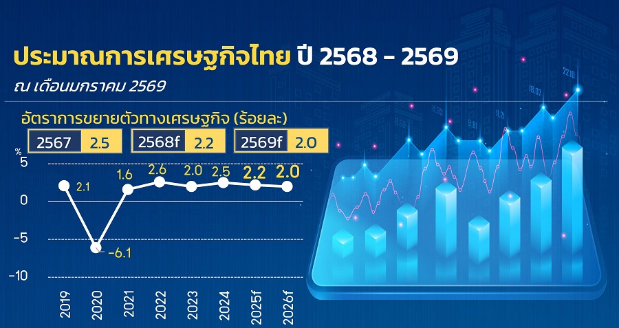 ศก.ไทยปี 2568 คาดว่าจะขยายตัวที่ร้อยละ 2.2 โดยได้รับปัจจัยสนับสนุนจากมาตรการกระตุ้น ศก. การเร่งรัดการเบิกจ่ายงบประมาณภาครัฐ และการส่งออกที่ดีกว่าคาด สำหรับปี 2569 คาดว่าจะขยายตัวที่ร้อยละ 2.0 ท่ามกลางความท้าทายจากมาตรการภาษีตอบโต้ทางการค้าของสหรัฐ