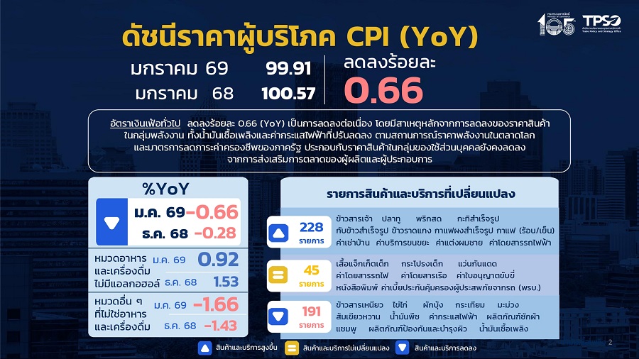 นางสาวณัฐิยา สุจินดา รองผู้อำนวยการสำนักงานนโยบายและยุทธศาสตร์การค้า เปิดเผยว่า ดัชนีราคาผู้บริโภคทั่วไปของไทย เดือนมกราคม 2569 เท่ากับ 99.91 เมื่อเทียบกับเดือนมกราคม 2568 ซึ่งเท่ากับ 100.57 ทำให้อัตราเงินเฟ้อทั่วไปลดลงร้อยละ 0.66 (YoY) โดยมีปัจจัยสำคัญจากการปรับลดลงของราคาสินค้าในกลุ่มพลังงาน ทั้งน้ำมันเชื้อเพลิงและค่ากระแสไฟฟ้าที่ปรับลดลง ตามสถานการณ์ราคาพลังงานในตลาดโลก และมาตรการลดภาระค่าครองชีพของภาครัฐ ประกอบกับราคาสินค้าในกลุ่มของใช้ส่วนบุคคลยังคงลดลง จากการจัดกิจกรรมส่งเสริมการตลาดของผู้ผลิตและผู้ประกอบการ ขณะที่สินค้าในกลุ่มอาหารและเครื่องดื่มไม่มีแอลกอฮอล์ปรับตัวสูงขึ้น จากการสูงขึ้นของราคาเครื่องดื่มไม่มีแอลกอฮอล์ และอาหารสำเร็จรูป เป็นสำคัญ สำหรับราคาสินค้าและบริการอื่น ๆ ส่งผลกระทบต่อภาวะเงินเฟ้อไม่มากนัก