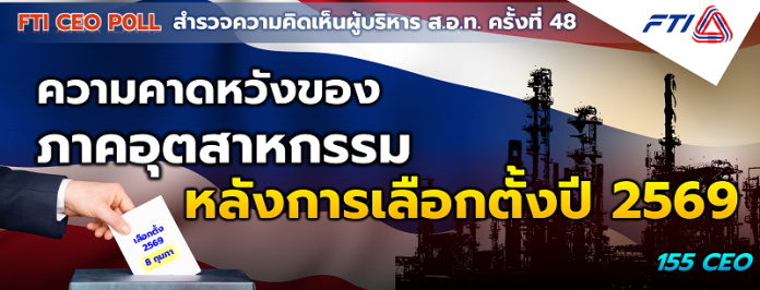 หม่อมหลวงปีกทอง ทองใหญ่ รองประธานสภาอุตสาหกรรมแห่งประเทศไทย (ส.อ.ท.) เปิดเผยผลการสำรวจ FTI CEO Poll ครั้งที่ 48 ประจำเดือนมกราคม 2569 ภายใต้หัวข้อ “ความคาดหวังของภาคอุตสาหกรรมหลังการเลือกตั้ง ปี 2569” ว่า ผู้บริหาร ส.อ.ท. ส่วนใหญ่ มีความเชื่อมั่นต่อนโยบายหาเสียงของพรรคการเมืองในการเลือกตั้งปี 2569 ว่าจะสามารถนำไปปฏิบัติได้จริงในระดับปานกลาง โดยให้ความสำคัญกับคุณลักษณะของนักการเมืองในด้านความซื่อสัตย์สุจริต ปราศจากประวัติการทุจริตเป็นอันดับแรก ขณะที่ผู้บริหาร ส.อ.ท. ยังประเมินว่า ผลการเลือกตั้งที่จะนำไปสู่การจัดตั้งรัฐบาลใหม่มีแนวโน้มออกมาในรูปแบบรัฐบาลผสม โดยมีพรรคการเมืองขนาดใหญ่เป็นแกนนำในการจัดตั้งรัฐบาล