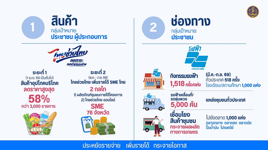 พาณิชย์เปิดเกมรุก “ไทยช่วยไทย” อัดมาตรการลดค่าครองชีพครั้งใหญ่ ดันสินค้า SMEs กว่า 3,000 รายการกระจายทั่วประเทศ ลุยร้านธงฟ้า-รถพุ่มพวงเข้าพื้นที่ห่างไกล เดินหน้า “ปุ๋ยคนละครึ่ง” จับมือ ธ.ก.ส. ปล่อยสินเชื่อ-อุดหนุนเพิ่มสูงสุด 2,100 บาท รับมือราคาปุ๋ยขาขึ้นทันที