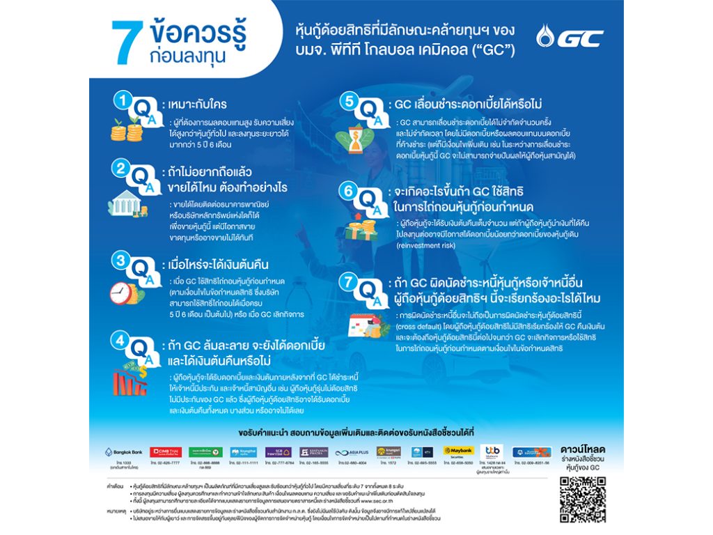 บริษัท พีทีที โกลบอล เคมิคอล จำกัด (มหาชน) หรือ GC ผู้นำในธุรกิจเคมีภัณฑ์ระดับสากล และแกนนำธุรกิจเคมีภัณฑ์ของกลุ่ม ปตท. ประกาศดอกเบี้ยหุ้นกู้ด้อยสิทธิที่มีลักษณะคล้ายทุน ไถ่ถอนเมื่อเลิกบริษัท ซึ่งผู้ออกหุ้นกู้มีสิทธิไถ่ถอนหุ้นกู้ก่อนกำหนด (“หุ้นกู้ด้อยสิทธิที่มีลักษณะคล้ายทุนฯ”) สำหรับ 5 ปี 6 เดือนแรกที่ 4.40% ต่อปี คาดเสนอขายต่อผู้ลงทุนทั่วไป (Public offering) ระหว่างวันที่ 27 – 28 พฤศจิกายน และ 1 – 3 ธันวาคม 2568 ผ่าน 12 สถาบันการเงิน