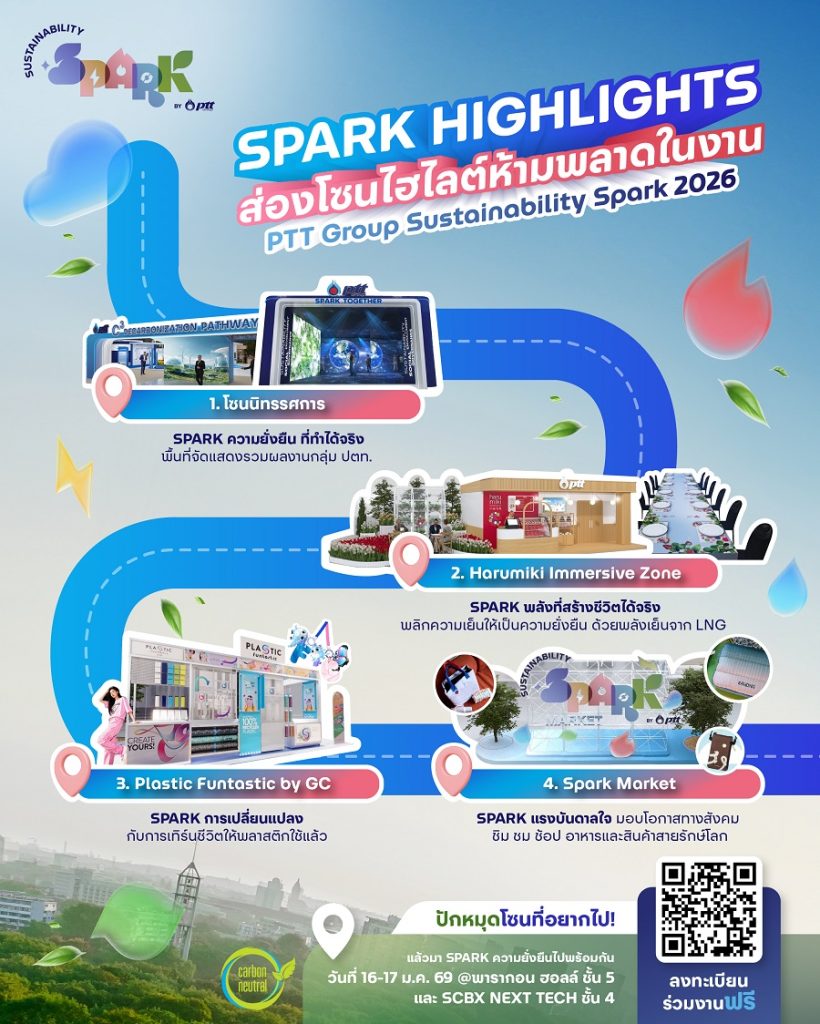 กลุ่ม ปตท. ขอเชิญชวนทุกท่านร่วมเป็นส่วนหนึ่งของการจุดประกายอนาคตที่ยั่งยืน ในงาน “Sustainability Spark by PTT Group 2026: Sparking the Future พลังจุดประกายอนาคต”
