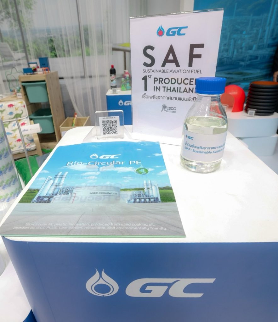 GC เป็นผู้บุกเบิกการผลิต SAF เชิงพาณิชย์รายแรกของประเทศไทย ผ่านการพัฒนาโรงกลั่นชีวภาพที่ใช้เทคโนโลยี Co-processing เปลี่ยนน้ำมันพืชใช้แล้ว (Used Cooking Oil: UCO) ให้กลายเป็นพลังงานสะอาดและวัตถุดิบชีวภาพ โดยเลือกปรับปรุงและต่อยอดโรงกลั่นเดิมให้เกิดประสิทธิภาพสูงสุด ช่วยลดต้นทุนและระยะเวลาเมื่อเทียบกับการลงทุนสร้างโรงงานใหม่ กระบวนการดังกล่าวได้รับการรับรองมาตรฐานความยั่งยืนระดับสากล ISCC CORSIA ซึ่งเป็นที่ยอมรับในอุตสาหกรรมการบินทั่วโลก และสามารถลดการปล่อยก๊าซคาร์บอนไดออกไซด์ได้สูงสุดถึง 85% เมื่อเทียบกับน้ำมันเชื้อเพลิงอากาศยานทั่วไป ตอกย้ำกลยุทธ์ธุรกิจมูลค่าสูงและคาร์บอนต่ำที่สามารถดำเนินการได้จริง