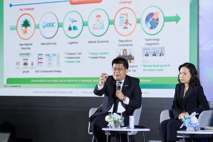 นายกฤษฎา ประเสริฐสุโข กรรมการผู้จัดการ บริษัท โกลบอลกรีนเคมิคอล จำกัด (มหาชน) หรือ GGC ร่วมบรรยายพิเศษกับวิทยากรระดับชั้นนำในหัวข้อ “ฝ่าความท้าทาย ดันอุตสาหกรรมไทยสู่อนาคตยั่งยืน” ภายในงาน OIE Forum ครั้งที่ 17 ภายใต้แนวคิด “Rising Beyond Challenges : Toward Sustainability for Thailand’s Industries ซึ่งจัดโดยสำนักงานเศรษฐกิจอุตสาหกรรม (สศอ.) พร้อมโชว์บทบาทความเป็นผู้นำในอุตสาหกรรมปาล์มไทย รุกแผนสร้างมูลค่าเพิ่มจาก “น้ำมันปาล์ม” สู่ Oleochemicals High Value Products ป้อนตลาดเครื่องสำอางและสุขภาพระดับโลก พร้อมเปิดตัวการนำนวัตกรรมเทคโนโลยีดาวเทียมและ AI ติดตามการกักเก็บคาร์บอน ยกระดับสวนปาล์มไทยสู่ “Low Carbon Supply Chain” แห่งแรกในอาเซียน ณ ศูนย์การประชุมแห่งชาติสิริกิติ์.
