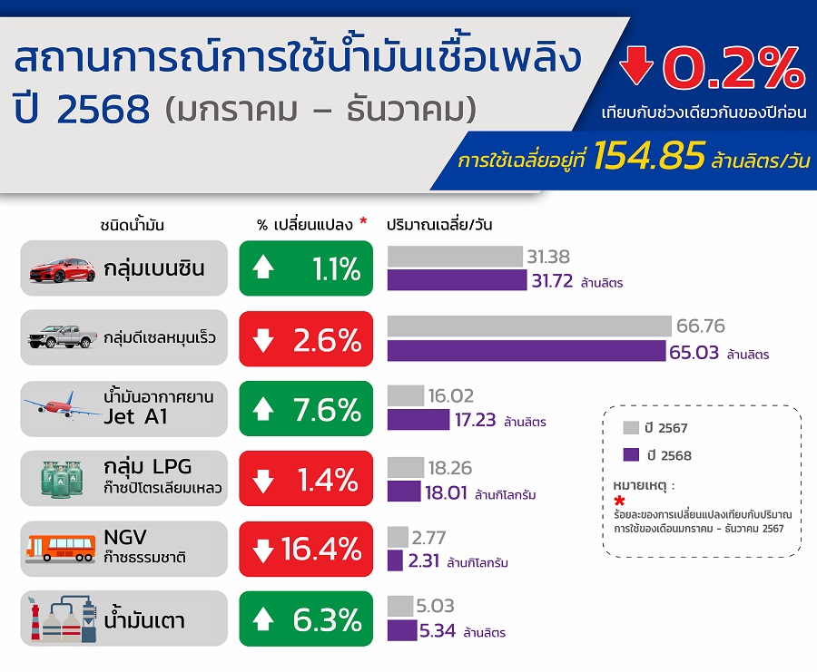 กรมธุรกิจพลังงานเผยปี 68 มีการใช้น้ำมันเชื้อเพลิงปี 154.85 ล้านลิตร/วัน ลดลงร้อยละ 0.2 เมื่อเทียบกับช่วงเดียวกันของปีก่อน