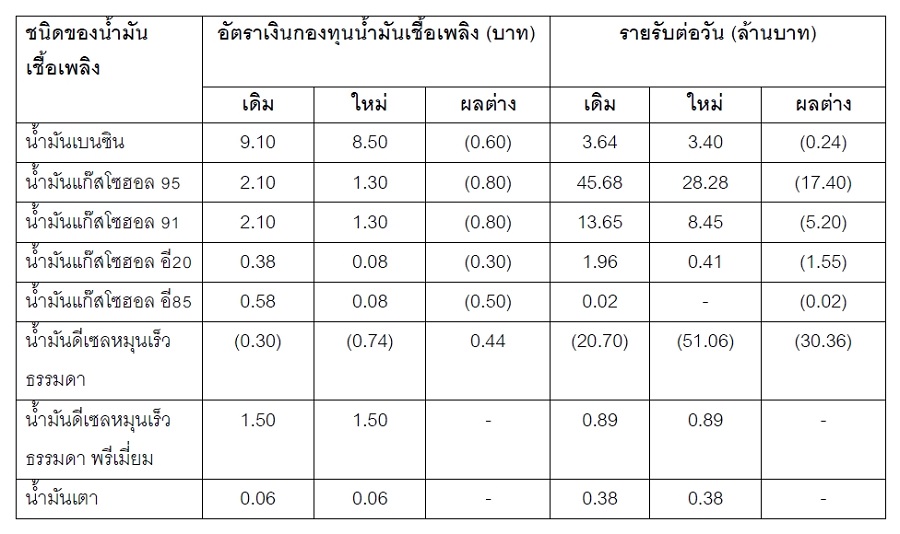 ปัจจุบัน ฐานะกองทุนนํ้ามันฯ ณ วันที่ 22 กุมภาพันธ์ 2569 กองทุนนํ้ามันฯ เป็นบวกอยู่ที่ 2,385 ล้านบาท แบ่งเป็น บัญชีนํ้ามันบวกอยู่ที่ 40,374 ล้านบาท และบัญชี LPG ติดลบอยู่ที่ 37,989 ล้านบาท ส่วนการปรับลดอัตราเงินส่งเข้ากองทุนนํ้ามันฯ ประเภทนํ้ามัน จะทำให้รายรับลดลงประมาณวันละ 54.77 ล้านบาท จากเดิ่มจากเดิมที่มีรายรับประมาณวันละ 45.52 ล้านบาท เป็นมีรายจ่ายประมาณวันละ 9.25 ล้านบาท (รายละเอียดในตาราง)