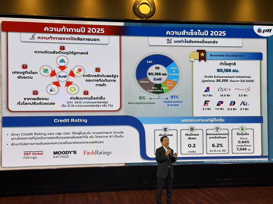 โดยมุ่งเน้นธุรกิจหลัก Hydrocarbon ซึ่งมีความเชี่ยวชาญ พร้อมทบทวนกลยุทธ์และปรับพอร์ตธุรกิจ Non-Hydrocarbon อีกทั้งสร้างความแข็งแรงจากภายใน ยกระดับประสิทธิภาพการดำเนินงานผ่านโครงการสำคัญ ได้แก่ การบริหารความร่วมมือด้าน Supply Chain ผ่านโครงการ P1 และ D1 ยกระดับประสิทธิภาพการทำงานผ่านโครงการ MissionX รวมถึงผลักดันการนำ Digital Tools และ AI มาใช้อย่างคุ้มค่าผ่านโครงการ AXIS นอกจากนี้ยังสร้างมูลค่าเพิ่มจากความร่วมมือภายในกลุ่มกว่า 38,000 ล้านบาท (Profit Enhancement) ส่งผลให้ ปตท. และบริษัทย่อยมีกำไรสุทธิ 90,166 ล้านบาท ในปี 2568 พร้อมจ่ายเงินปันผลในอัตรา 2.30 บาทต่อหุ้น โดยเป็นเงินปันผลจ่ายสำหรับผลประกอบการประจำปี 2.10 บาทต่อหุ้น และเพิ่มเงินปันผลพิเศษเป็นครั้งแรกอีก 0.20 บาทต่อหุ้น ในขณะเดียวกันยังคงรักษาวินัยทางการเงินอย่างเคร่งครัด และได้รับการจัดอันดับความน่าเชื่อถือในระดับที่แข็งแกร่ง สะท้อนฐานะการเงินแข็งแกร่งมั่นคง พร้อมรองรับการเติบโตตามกลยุทธ์ในอนาคตและสร้างผลตอบแทนที่ดีให้แก่ผู้ถือหุ้น