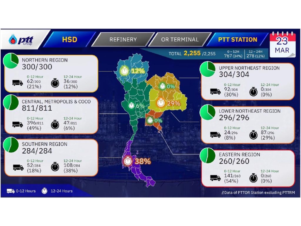 ในบางช่วงเวลาอาจมีบางสถานีบริการต้องรอการเติมน้ำมัน เนื่องจากความต้องการใช้น้ำมันเพิ่มขึ้นผิดปกติในบางพื้นที่ โดยข้อมูลล่าสุดพบว่าพื้นที่ที่มีการรอการเติมน้ำมัน เกิน 12 ชั่วโมง เกิดขึ้นเฉพาะบางพื้นที่ เช่น ภาคตะวันออกเฉียงเหนือตอนล่าง และภาคใต้ ซึ่งทีมขนส่งกำลังเร่งเติมน้ำมันเข้าสู่สถานีบริการอย่างต่อเนื่อง