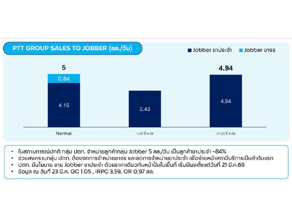 นอกจากนี้ กลุ่ม ปตท. ยังได้จัดสรรน้ำมันให้แก่ผู้ค้าส่ง (Jobber) อย่างต่อเนื่อง เพื่อช่วยกระจายน้ำมันไปยังผู้ใช้น้ำมันในภาคขนส่ง เกษตร และภาคอุตสาหกรรม โดยใน ภาวะปกติ กลุ่ม ปตท. จำหน่ายน้ำมันให้ Jobber ประมาณ 5 ล้านลิตรต่อวัน และหลังจากสถานการณ์เริ่มคลี่คลายได้ เพิ่มการจำหน่ายกลับมาใกล้ระดับปกติที่ประมาณ 4,94 ล้านลิตรต่อวัน โดยกำหนดราคาขาย Jobber เท่ากับราคาขายที่หน้าสถานีบริการในพื้นที่