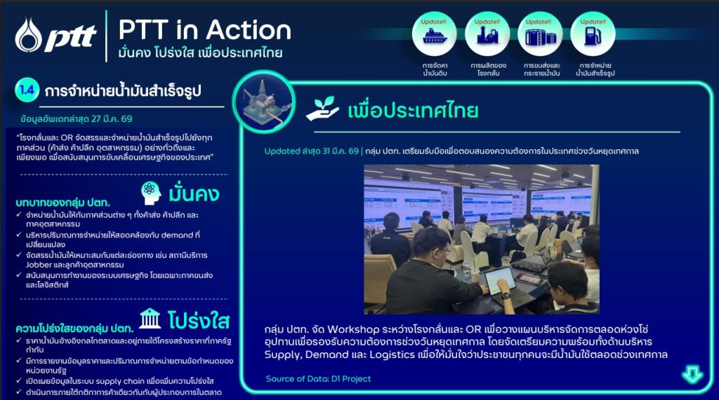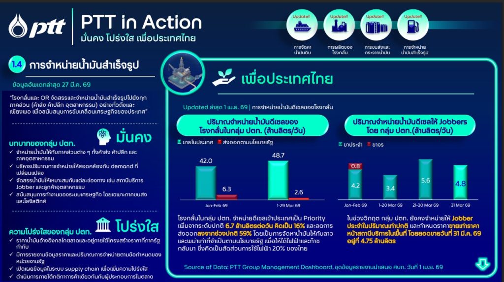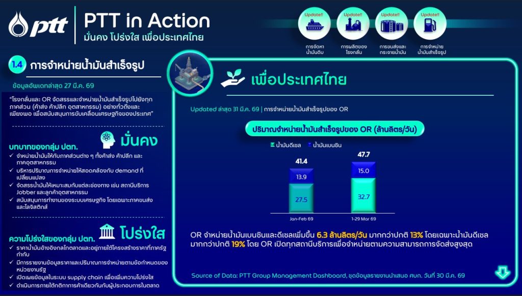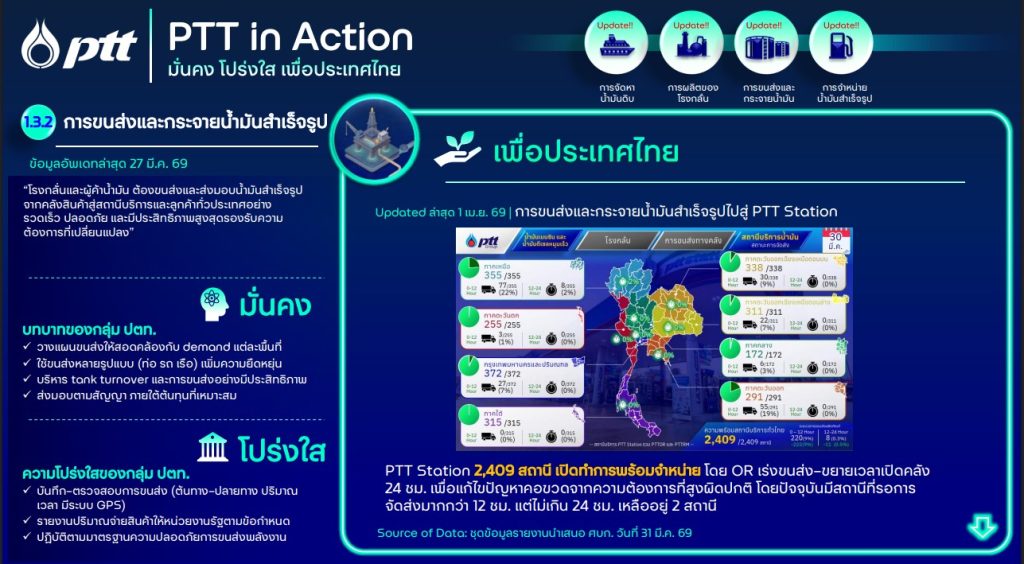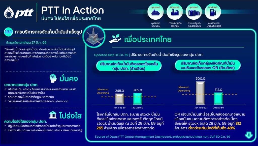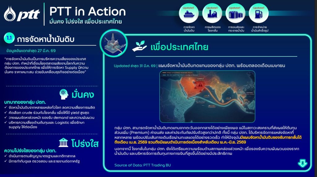 บริษัท ปตท. จำกัด (มหาชน) หรือ ปตท. เปิดเผยว่า ตลอดระยะเวลาการดำเนินธุรกิจพลังงานปตท. และบริษัทในกลุ่ม รายงานข้อมูลปริมาณและราคาน้ำมัน ตามข้อกำหนดต่อหน่วยงานรัฐมาอย่างต่อเนื่อง จากสถานการณ์ความไม่สงบในตะวันออกกลาง ส่งผลกระทบด้านพลังงานไปทั่วโลก ปตท. มุ่งมั่นสร้างความมั่นคงพลังงาน โดยยึดหลัก “มั่นคง โปร่งใส เพื่อประเทศไทย” ให้ความสำคัญกับประโยชน์ของประเทศและประชาชน พร้อมเปิดเผยข้อมูลปริมาณน้ำมันตลอดห่วงโซ่อุปทานอย่างโปร่งใส