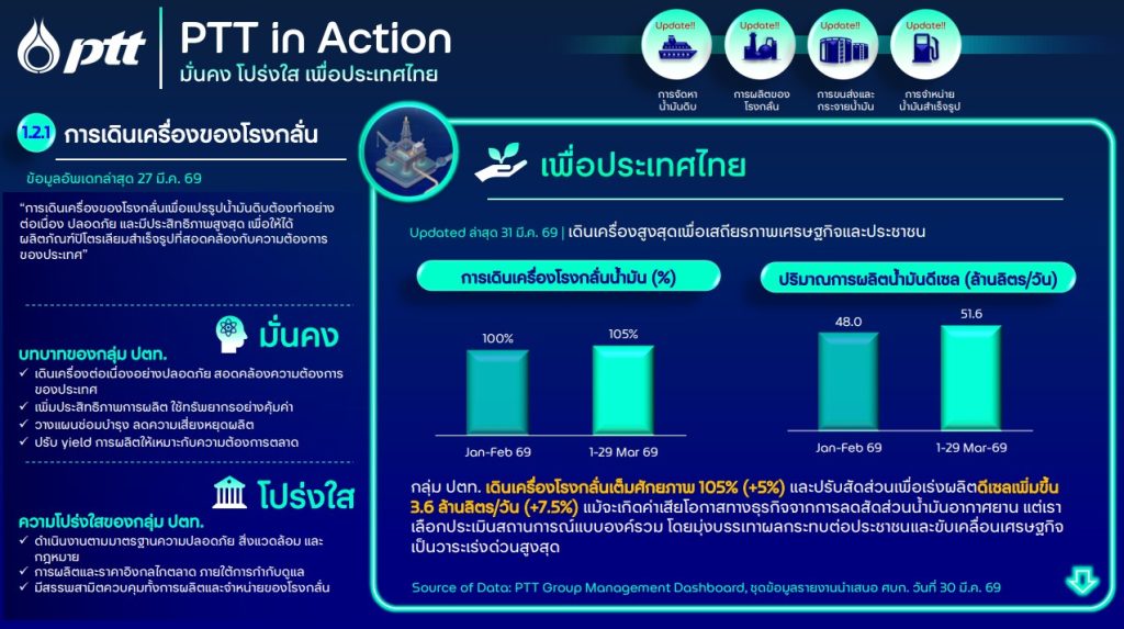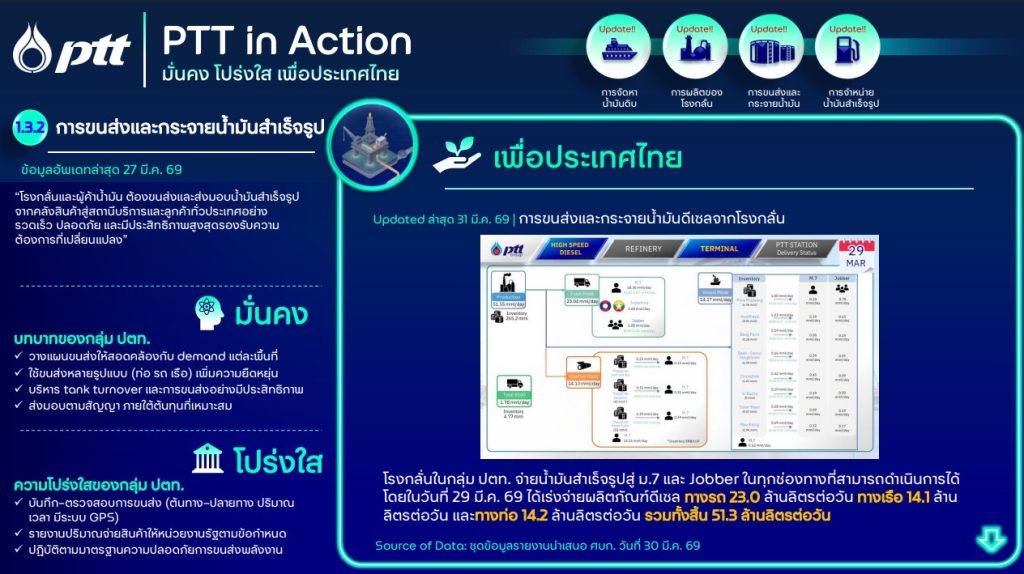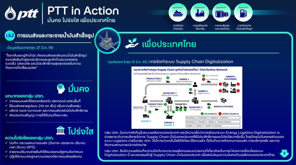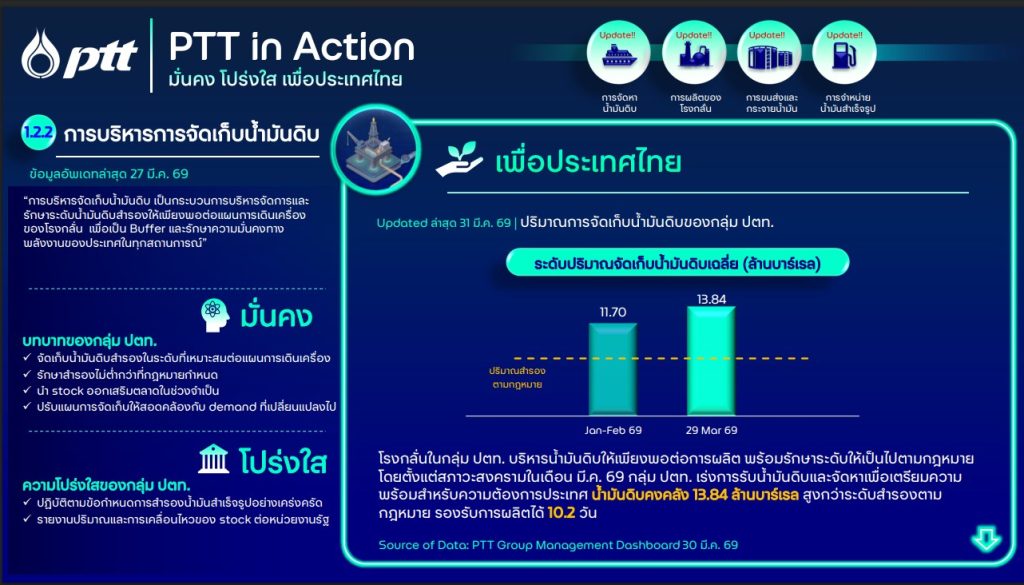 กลุ่ม ปตท. บริหารจัดการและกระจายความเสี่ยงในการจัดหาน้ำมันดิบจากหลากหลายแหล่งทั่วโลก เพื่อให้ประเทศไทยมีพลังงานใช้อย่างเพียงพอและต่อเนื่อง ขณะเดียวกัน ดำเนินการเปิดเผยข้อมูลตามหลักเกณฑ์ของกระทรวงพลังงานอย่างเคร่งครัด เพื่อสร้างความโปร่งใสและสามารถตรวจสอบได้ โดยมีการรายงานข้อมูลต่อหน่วยงานภาครัฐ ทั้งนี้ ประชาชนสามารถติดตามสถานการณ์การบริหารจัดการพลังงานของ กลุ่ม ปตท. ตลอดห่วงโซ่อุปทาน (Supply Chain) แบบ Real-Time ผ่านเว็บไซต์ ปตท. https://www.pttplc.com ได้แล้ววันนี้ โดยประกอบด้วยข้อมูลปริมาณน้ำมันในระบบ การจัดหาน้ำมันดิบ การผลิตของโรงกลั่นน้ำมัน การขนส่งและกระจายน้ำมัน รวมถึงการจำหน่ายน้ำมันสำเร็จรูป เพื่อสร้างความมั่นใจในการบริหารจัดการพลังงานให้เพียงพอต่อความต้องการของประเทศ