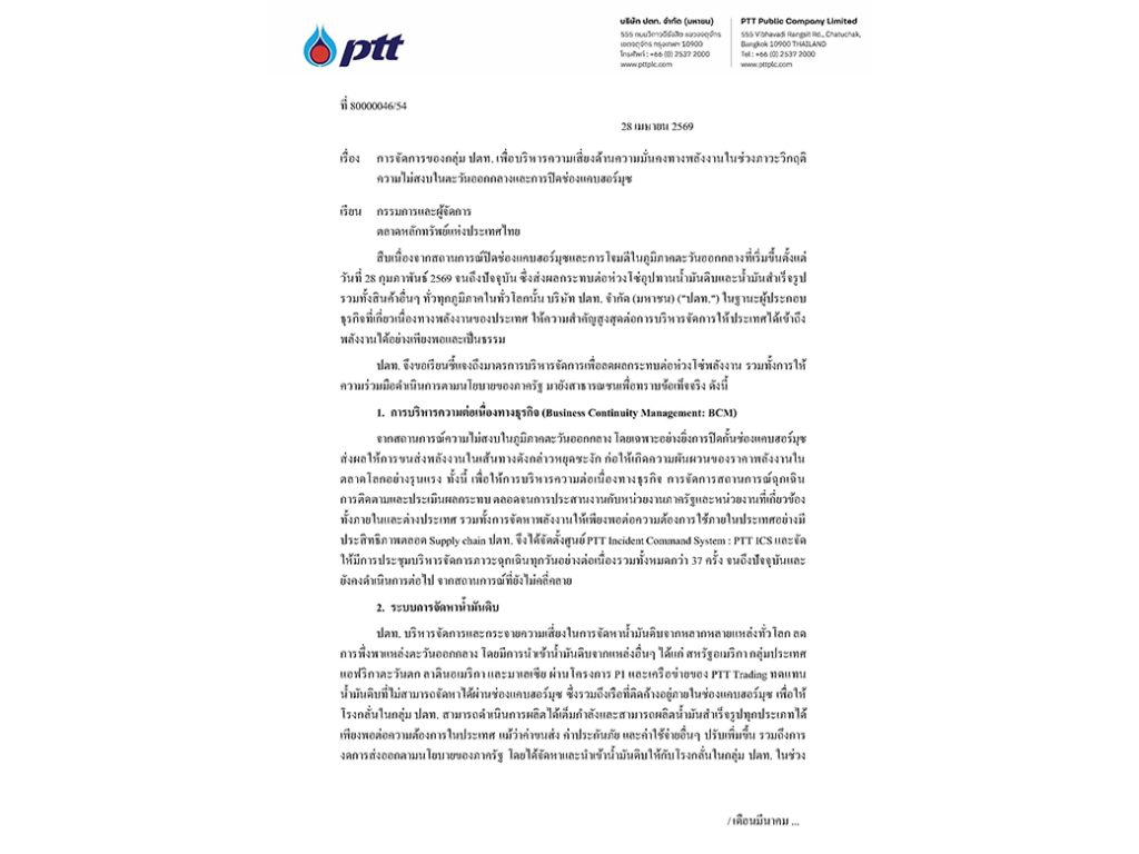 เมื่อวันที่ 28 เม.ย. 69 บริษัท ปตท. จำกัด ได้ส่งหนังสือกรรมการและผู้จัดการตลาดหลักทรัพย์แห่งประเทศไทย แจ้งเรื่องการจัดการของกลุ่ม ปตท. เพื่อบริหารความเสี่ยงด้านความมั่นคงทางพลังงานในช่วงภาวะวิกฤติ ความไม่สงบในตะวันออกกลางและการปิดช่องแคบฮอร์มุซ