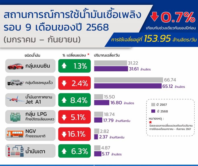 9 เดือนแรกปี 68 คนไทยน้ำมันเชื้อเพลิง 153.95 ล้านลิตรต่อวัน-ลดลงร้อยละ 0.7