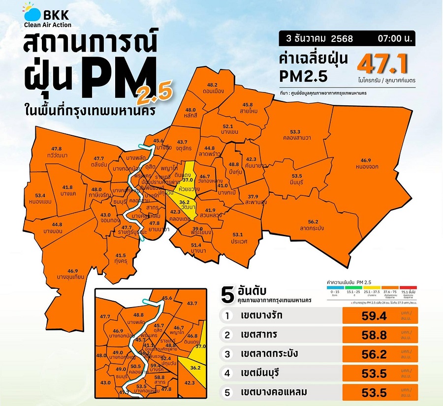 นอกจากนั้นกทม. ขอความร่วมมือทำงานที่บ้าน WFH และวันที่ 4 ธันวาคม 2568 ค่าฝุ่น PM2.5 สีส้ม มากกว่า 35 เขต