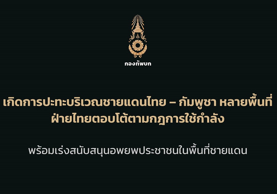 ทบ.เผยเกิดการปะทะชายแดนไทย – กัมพูชา ในหลายพื้นที่ ฝ่ายไทยตอบโต้ตามกฎการใช้กำลัง พร้อมเร่งสนับสนุนอพยพประชาชนในพื้นที่ชายแดน ขณะที่กองทัพบกที่ 2 สรุปไทม์ไลน์สถานการณ์ตามแนวชายแดนไทย-กัมพูชา