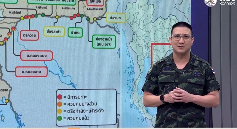 ด้าน พันเอก ริชฌา สุขสุวานนท์ รองโฆษกกองทัพบก กล่าวอัปเดตสถานการณ์ตามแนวชายแดนไทย-กัมพูชา ในภาพรวมยังคงมีการโจมตีฝ่ายกัมพูชาในทุกพื้นที่มีหนักเบา โดยฝ่ายไทยได้ควบคุมพื้นที่ได้หลายจุดและสถาปนาความมั่นคง เพื่อป้องกันการตีโต้ตอบจากฝ่ายกัมพูชา จังหวัดอุบลราชธานี ช่องอานม้า ซัมแต จังหวัดสุรินทร์ ช่องจอม ช่องเปลอ ช่องระยี ปราสาทคนา แต่ยังมีความพยายามโจมตีเข้ามาของฝ่ายกัมพูชาเพื่อช่วงชิงพื้นที่ แต่พื้นที่นี้ฝ่ายไทยยังได้เปรียบอยู่