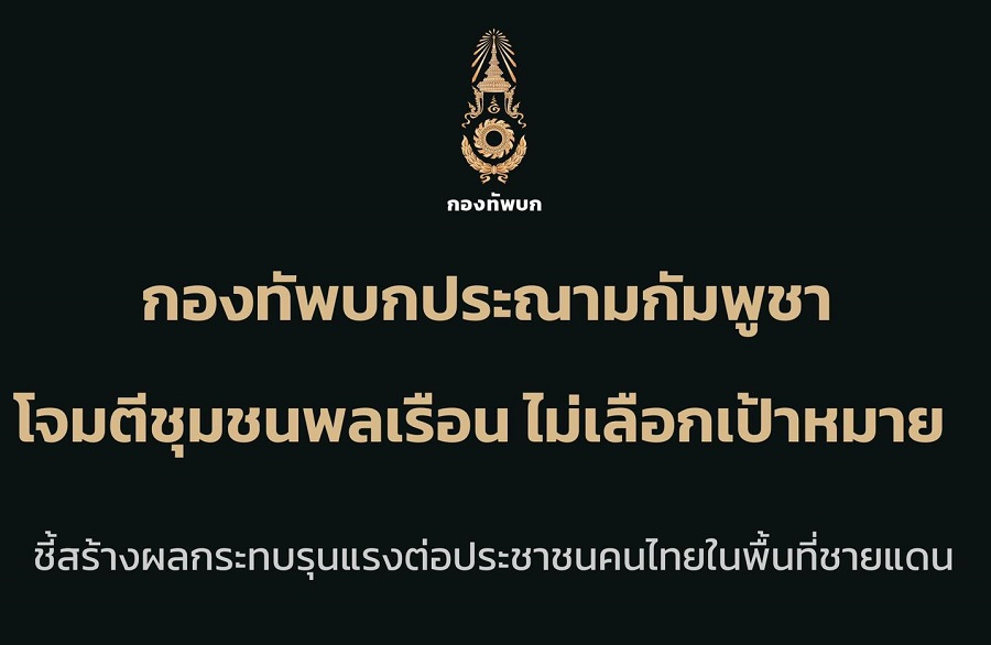 กองทัพบกประณามกัมพูชาโจมตีชุมชนพลเรือน ใช้กำลังไม่เลือกเป้าหมาย ชี้สร้างผลกระทบรุนแรงต่อประชาชนคนไทยในพื้นที่ชายแดน สรัางความตึงเครียดอย่างต่อเนื่อง มีประชาชนได้รับผลกระทบ 4 แสนคน