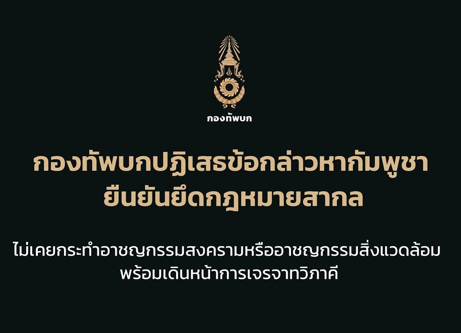 กองทัพบกปฏิเสธข้อกล่าวหากัมพูชา ยืนยันยึดกฎหมายสากล ไม่กระทำอาชญากรรมสงครามหรือสิ่งแวดล้อม พร้อมเดินหน้าการเจรจาทวิภาคี