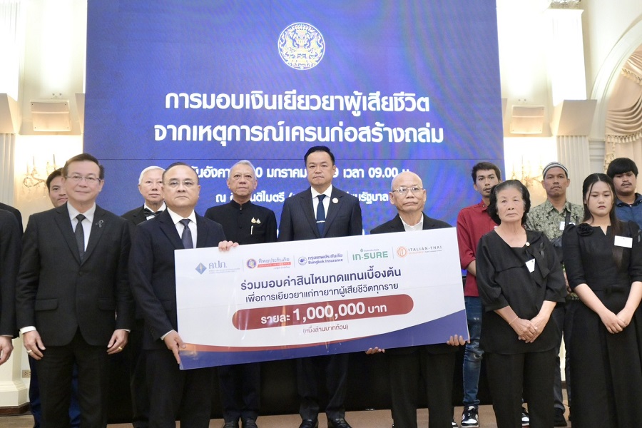 1.ค่าสินไหมทดแทนเบื้องต้นเพื่อการเยียวยาแก่ทายาทผู้เสียชีวิตฯ จากสำนักงานคณะกรรมการกำกับและส่งเสริมการประกอบธุรกิจประกันภัย (คปภ.) บริษัทกรุงเทพประกันภัย บริษัททิพยประกันภัย บริษัทอินทรประกันภัย และบริษัท อิตาเลียนไทย ดีเวล๊อปเมนต์ จำกัด (มหาชน) มอบให้ผู้เสียชีวิตรายละ 1 ล้านบาท