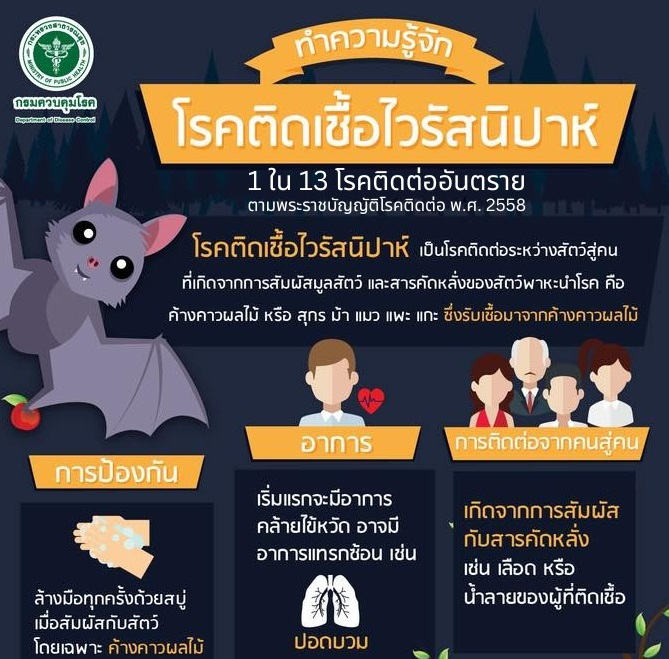 “ประเทศไทย ไม่เคยมีรายงานพบไวรัสนิปาห์ มีเพียงประเทศใกล้เคียง ซึ่งนานมากกว่า 10 ปี คือ มาเลเซีย สิงคโปร์ ดังนั้น สิ่งสำคัญขอให้รับฟังข้อมูลหน่วยงานรัฐ การเดินทางไปท่องเที่ยวยังทำได้ แต่ต้องระมัดระวัง และการเดินทางที่ค่อนข้างผจญภัย ป่าเขา เที่ยวถ้ำ ต้องระวัง และการรับประทานอาหารต้องสุก การสวมหน้ากากอนามัย ล้างมือให้สะอาด ยังเป็นมาตรการป้องกันเชื้อได้ ที่สำคัญหลีกเลี่ยงการสัมผัสสัตว์ที่อาจเป็นรังโรค เช่น ค้างคาวผลไม้ ในพื้นที่ที่พบการระบาดของเชื้อ”