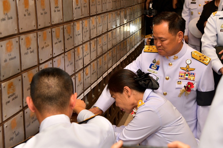 จากนั้น นายกรัฐมนตรีประกอบพิธีบรรจุอัฐิทหารผ่านศึกผู้เสียชีวิตจากการปฏิบัติหน้าที่ จำนวน 42 นาย ลงในบล็อกที่ 13 ในช่องที่กำหนด และยืนสงบนิ่ง ต่อมาพลแตรเดี่ยวเป่าสัญญาณแตรนอน/แตรเคารพ 1 จบ เจ้าหน้าที่สั่งพัก แล้วอนุศาสนาจารย์เรียนเชิญนายกรัฐมนตรี ประธานในพิธี จุดเครื่องทองน้อย และทอดผ้าบังสุกุลถวายแด่พระสงฆ์ จำนวน 4 รูป พระสงฆ์ทั้ง 4 รูป พิจารณาผ้าบังสุกุล ต่อจากนั้น นายกรัฐมนตรีประกอบพิธีกรวดน้ำเพื่ออุทิศส่วนกุศลแด่ดวงวิญญาณทหารผ่านศึก และถวายภัตตาหารพร้อมจตุปัจจัยไทยธรรมแด่พระสงฆ์ก่อนเสร็จพิธี