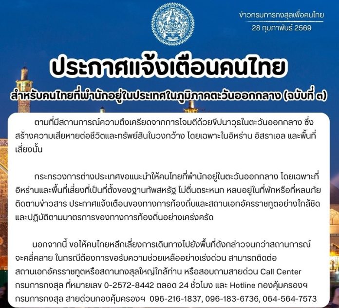 เมื่อวันที่ 1 มี.ค.69 ผู้สื่อข่าวรายงานว่า กระทรวงการต่างประเทศ โพสต์เฟซบุ๊ก ออกประกาศแจ้งเตือนคนไทย สำหรับคนไทยที่พำนักอยู่ในประเทศในภูมิภาคตะวันออกกลาง (ฉบับที่ 3) มีเนื้อหาว่า ตามที่มีสถานการณ์ความตึงเครียดจากการโจมตีด้วยขีปนาวุธในตะวันออกกลาง ซึ่งสร้างความเสียหายต่อชีวิตและทรัพย์สินในวงกว้าง โดยเฉพาะในอิหร่าน อิสราเอล และพื้นที่เสี่ยงนั้น กระทรวงการต่างประเทศขอแนะนำให้คนไทยที่พำนักอยู่ในตะวันออกกลาง โดยเฉพาะที่อิหร่านและพื้นที่เสี่ยงที่เป็นที่ตั้งของฐานทัพสหรัฐ ไม่ตื่นตระหนก หลบอยู่ในที่พักหรือที่หลบภัย ติดตามข่าวสาร ประกาศแจ้งเตือนของทางการท้องถิ่นและสถานเอกอัครราชทูตอย่างใกล้ชิด และปฏิบัติตามมาตรการของทางการท้องถิ่นอย่างเคร่งครัด