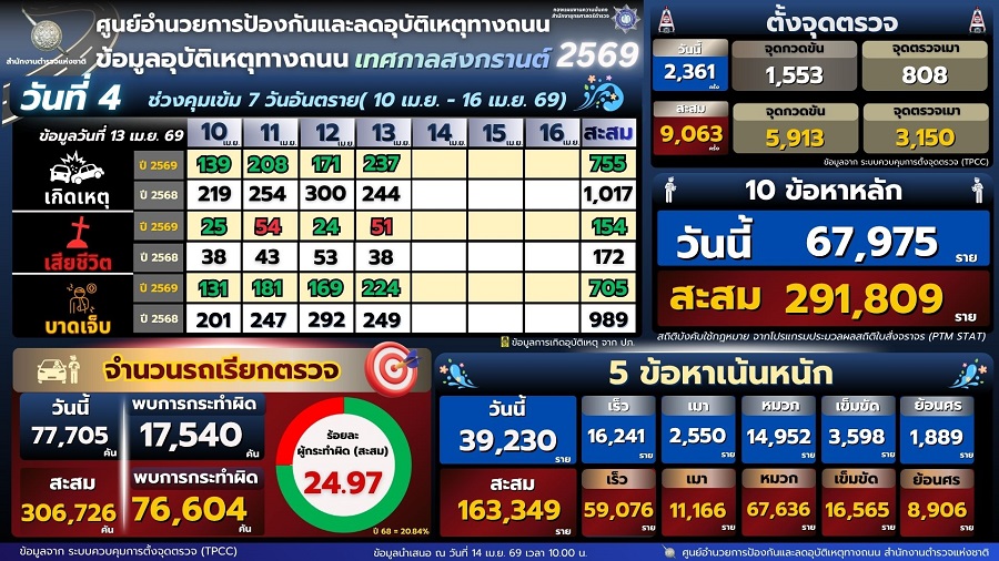 ส่วนสถิติการบังคับใช้กฎหมาย 4 วัน ของการควบคุมเข้มข้นทั่วประเทศ ระหว่างวันที่ 10 – 13 เมษายน 2569 ผู้กระทำผิดใน 10 ข้อหาหลักทั่วประเทศ มียอดรวมทั้งสิ้น 291,809 ราย โดยเป็นความผิดใน 5 ข้อหาเน้นหนัก ได้แก่ ไม่สวมหมวกนิรภัย 67,636 ราย ขับรถเร็วเกินกฎหมายกำหนด 59,076 ราย ไม่คาดเข็มขัดนิรภัย 16,565 ราย ขับรถขณะเมาสุรา 11,166 ราย (พบกระทำผิดซ้ำ 114 ราย) และขับรถย้อนศร 8,906 ราย