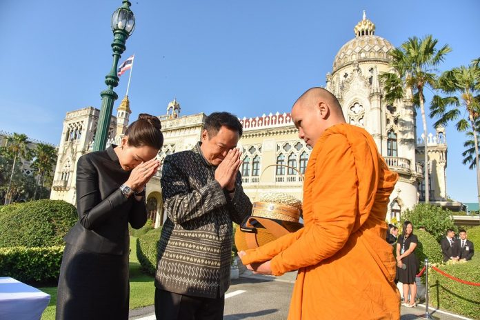 โดยเมื่อนายกรัฐมนตรีเดินทางถึงตึกสันติไมตรี (หลังนอก) พระสงฆ์จำนวน 10 รูป ขึ้นนั่งอาสน์สงฆ์ นายกรัฐมนตรีจุดธูปเทียนบูชาพระรัตนตรัย เจ้าหน้าที่อาราธนาศีล พระสงฆ์ให้ศีลและเจริญพระพุทธมนต์ นายกรัฐมนตรี รองนายกรัฐมนตรี พร้อมด้วย ครม. ถวายผ้าไตรและถวายเครื่องไทยธรรม จำนวน 10 รูป โดยนายกรัฐมนตรีถวายสมเด็จพระพุฒาจารย์ วัดไตรมิตรวิทยาราม ประธานสงฆ์ พระสงฆ์สวดอนุโมทนา นายกรัฐมนตรีกรวดน้ำรับพร ประธานสงฆ์ประพรมน้ำพระพุทธมนต์