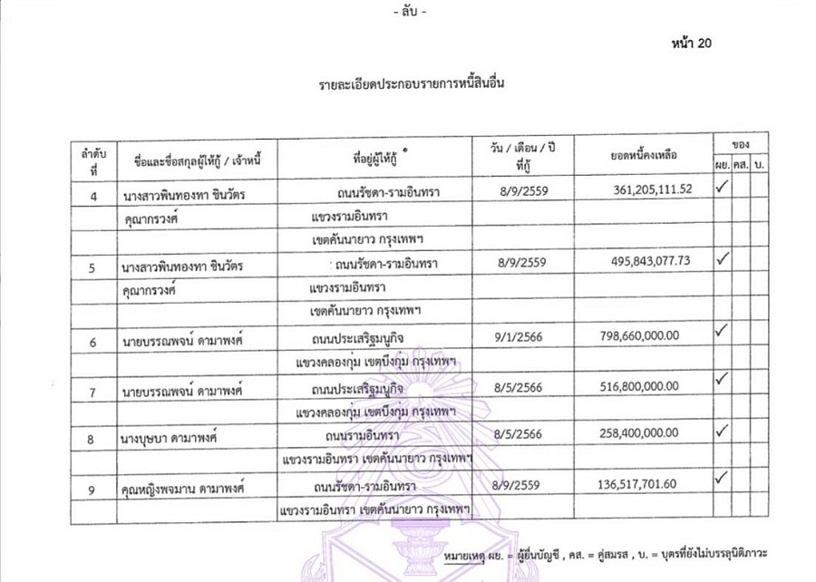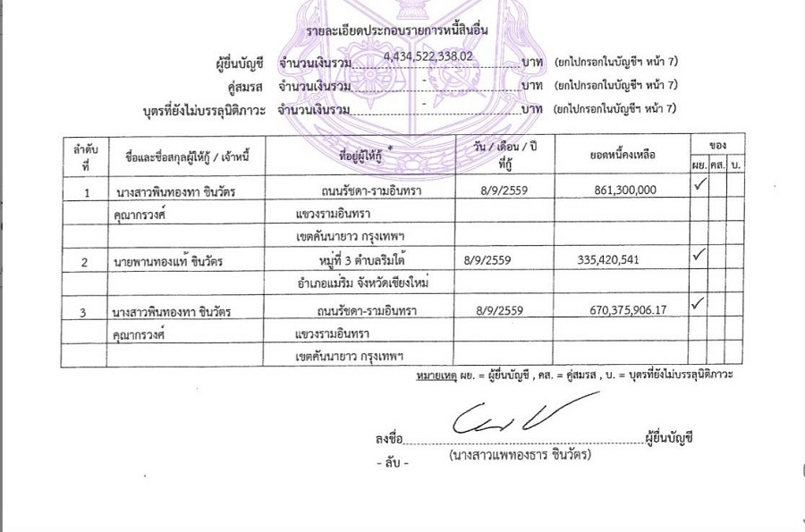 สำหรับหนี้สินอื่นของ น.ส.แพทองธาร ที่แจ้งมูลค่า 4,434,522,338 บาทนั้น คือหนี้สินในส่วนของตั๋วสัญญาใช้เงิน หรือตั๋ว PNในการซื้อหุ้นต่อจากมารดา พี่ชาย และเครือญาติ รวม 5 รายการ ที่ถูกฝ่ายค้านอภิปรายไม่ไว้วางใจไปเมื่อต้นปี 2568 ว่าส่อเข้าข่ายเป็นการกระทำนิติกรรมอำพรางหรือไม่ ซึ่งการแจ้งในรายการทรัพย์สินหลังพ้นตำแหน่ง เท่ากับว่า น.ส.แพทองธาร ยังคงไม่มีการชำระเงินค่าหุ้นดังกล่าวแต่อย่างใด.