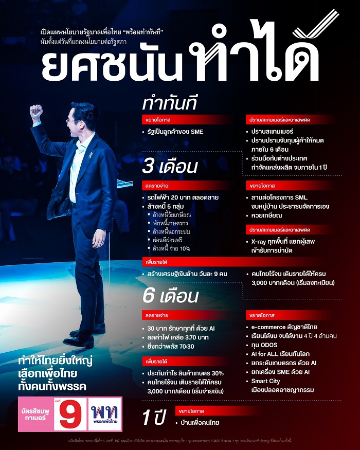 “เพื่อไทย”เปิดไทม์ไลน์นโยบายพรรค1ปี ทำทันทีเมื่อ“ยศชนัน”ได้เป็นผู้นำรัฐบาล