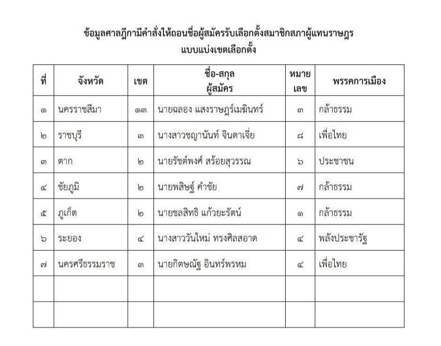 จากข้อมูลล่าสุด ศาลฎีกาได้มีคำสั่งให้ถอนชื่อผู้สมัครรับเลือกตั้ง สส. แบบแบ่งเขตเลือกตั้ง ตามที่ ผอ.การเลือกตั้งประจำเขตเลือกตั้ง พบว่าผู้สมัครใดขาดคุณสมบัติหรือมีลักษณะต้องห้าม ดังนี้ 1.นายฉลอง แสงราษฎร์เมขินทร์ ผู้สมัคร สส.นครราชสีมา เขต13 หมายเลข3 พรรคกล้าธรรม 2.น.ส.ชญานันท์ จินดาเจี่ย ผู้สมัคร สส.ราชบุรี เขต3 หมายเลข 8 พรรคเพื่อไทย 3.นายรัชต์พงศ์ สร้อยสุวรรณ ผู้สมัคร สส.ตาก เขต2 หมายเลข6 พรรคประชาชน 4.นายพสิษฐ์ คำชัย ผู้สมัคร สส.ชัยภูมิ เขต 2 หมายเลข7 พรรคกล้าธรรม 5.นายชลสิทธิ แก้วยะรัตน์ ผู้สมัคร สส.ภูเก็ต เขต2 หมายเลข1 พรรคกล้าธรรม 6.น.ส.วันใหม่ ทรงศิลสอาด ผู้สมัคร สส.ระยอง เขต4 หมายเลข4 พรรคพลังประชารัฐ และ 7.นายกิตษณัฐ อินทร์พรหม ผู้สมัคร สส.นครศรีธรรมราช เขต3 หมายเลข4 พรรคกล้าธรรม