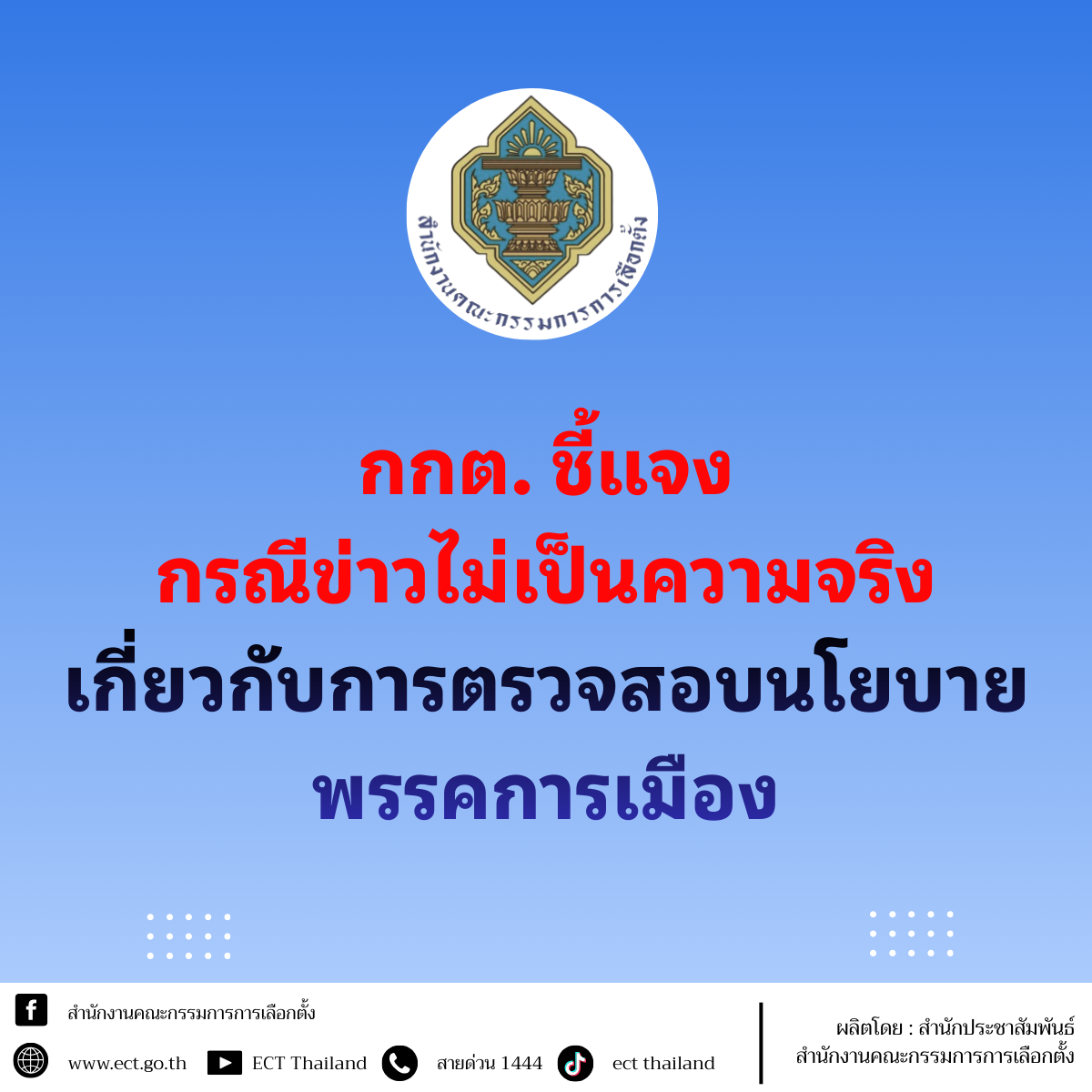 อย่าเชื่อข้อมูลลวง! สำนักงาน กกต. ออกโรงชี้แจงด่วน กรณีข่าวสะพัดเตรียมสั่งปรับพรรคเพื่อไทยเหตุไม่แจ้งรายละเอียดนโยบาย “เศรษฐีเงินล้านวันละ 9 คน” ยันคณะกรรมการยังไม่มีมติใดๆ ตามที่กล่าวอ้าง วอนประชาชนเช็กข้อมูลจากแหล่งข่าวทางการก่อนส่งต่อ หวั่นทำลายความเชื่อมั่นการเลือกตั้ง 8 ก.พ. นี้