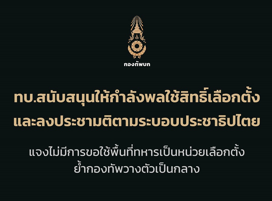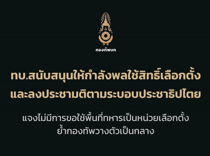 ขอยืนยันว่า ปัจจุบันกองทัพบกไม่มีการใช้พื้นที่ภายในหน่วยทหารเป็นหน่วยลงคะแนนเลือกตั้ง และไม่มีกำลังพลเข้าไปเป็นผู้ช่วยกรรมการในหน่วยเลือกตั้งใดๆ รวมถึงไม่มีการเข้าไปยุ่งเกี่ยวกับหีบบัตรเลือกตั้งทั้งสิ้น”