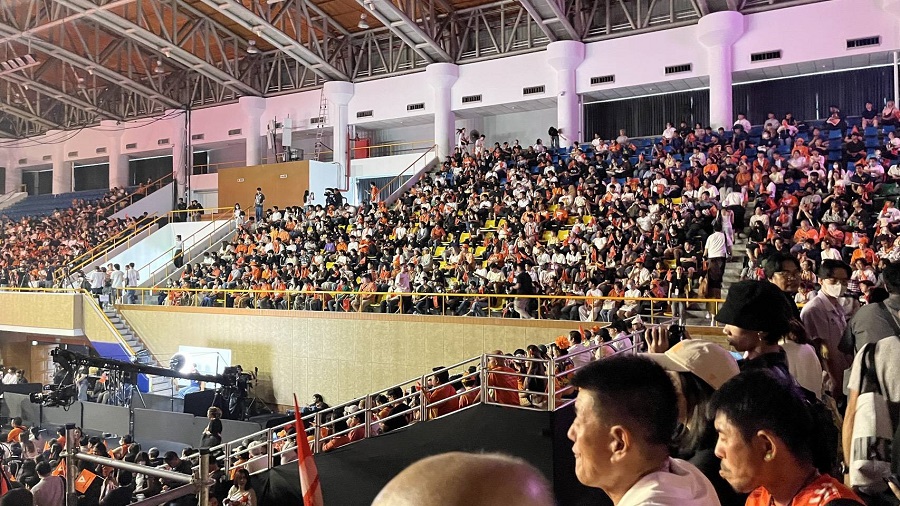 เมื่อวันที่ 6 ก.พ. ที่อาคารกีฬาเวสน์ 1 ศูนย์กีฬาไทย-ญี่ปุ่น ดินแดง ผู้สื่อข่าวรายงานบรรยากาศเวทีปราศรัยใหญ่ครั้งสุดท้าย “ประชาชนเปลี่ยนประเทศ” ของพรรคประชาชน ซึ่งนำโดยนายณัฐพงษ์ เรืองปัญญาวุฒิ หัวหน้าพรรคและแคนดิเดตนายกรัฐมนตรี พรรคประชาชน ว่า มีประชาชนมารอเข้าอาคารตั้งแต่ช่วงเช้า เวลา 08.00 น. ส่วนใหญ่ใส่เสื้อสีส้ม สวมหมวกสีส้ม บางคนได้เขียนป้ายให้กำลังใจแกนนำพรรค โดยเฉพาะนายณัฐพงษ์ และมีการนำธงสีส้มมาโบกด้วย