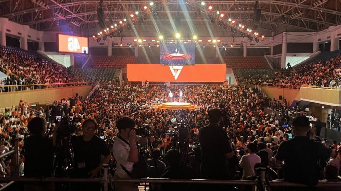 เมื่อวันที่ 6 ก.พ. ที่อาคารกีฬาเวสน์ 1 ศูนย์กีฬาไทย-ญี่ปุ่น ดินแดง ผู้สื่อข่าวรายงานบรรยากาศเวทีปราศรัยใหญ่ครั้งสุดท้าย “ประชาชนเปลี่ยนประเทศ” ของพรรคประชาชน ซึ่งนำโดยนายณัฐพงษ์ เรืองปัญญาวุฒิ หัวหน้าพรรคและแคนดิเดตนายกรัฐมนตรี พรรคประชาชน ว่า มีประชาชนมารอเข้าอาคารตั้งแต่ช่วงเช้า เวลา 08.00 น. ส่วนใหญ่ใส่เสื้อสีส้ม สวมหมวกสีส้ม บางคนได้เขียนป้ายให้กำลังใจแกนนำพรรค โดยเฉพาะนายณัฐพงษ์ และมีการนำธงสีส้มมาโบกด้วย