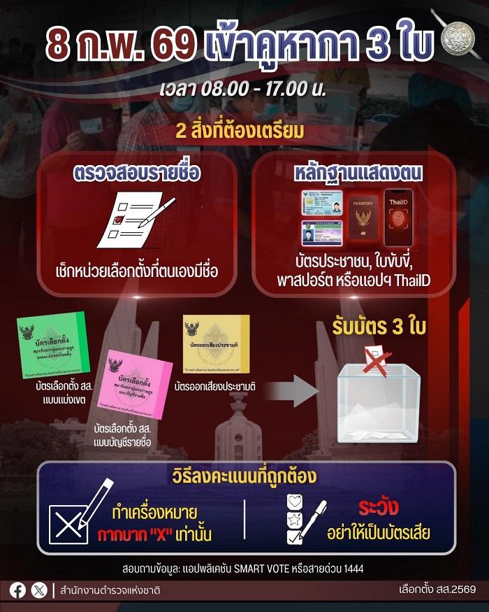 เพจสำนักงานตำรวจแห่งชาติแนะนำวิธีเตรียมตัวไปใช้สิทธิืเลือกตั้ง 8 ก.พ. ย้ำพร้อมดูแลอำนวยความสะดวกให้ประชาชน