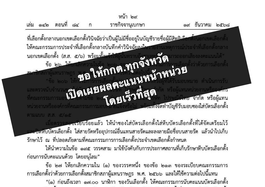อย่างไรก็ดี ก่อนการเลือกตั้งปี 2569 กกต. ได้แก้ไขระเบียบข้อ 214 เปลี่ยนจากที่กำหนดเวลาให้ต้องเผยแพร่เอกสารส.ส.5/18 และส.ส.5/18 (บช.) ภายใน 5 วัน เป็นต้องเผยแพร่ “โดยเร็ว” ไม่ได้กำหนดว่าจะต้องภายในกี่วัน